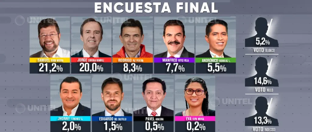 De acuerdo con el estudio, presentado este domingo a tan solo una semana de las elecciones generales del 17 de agosto, Samuel Doria Medina (Alianza Unidad) encabeza la preferencia electoral con un 21,2%, seguido muy de cerca por Jorge “Tuto” Quiroga (Alianza Libre), que obtiene el 20%.