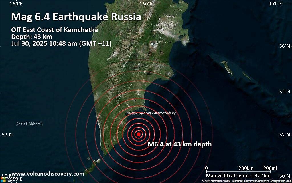 Un potente terremoto de magnitud 8.8 sacudió el litoral este de la península de Kamchatka (Rusia) el 30 de julio de 2025, a una profundidad de aproximadamente 20 km, a unos 120‑130 km al este-sureste de Petropavlovsk‑Kamchatsky. Es el sismo más fuerte en la región desde 1952 y uno de los más grandes registrados a nivel mundial.